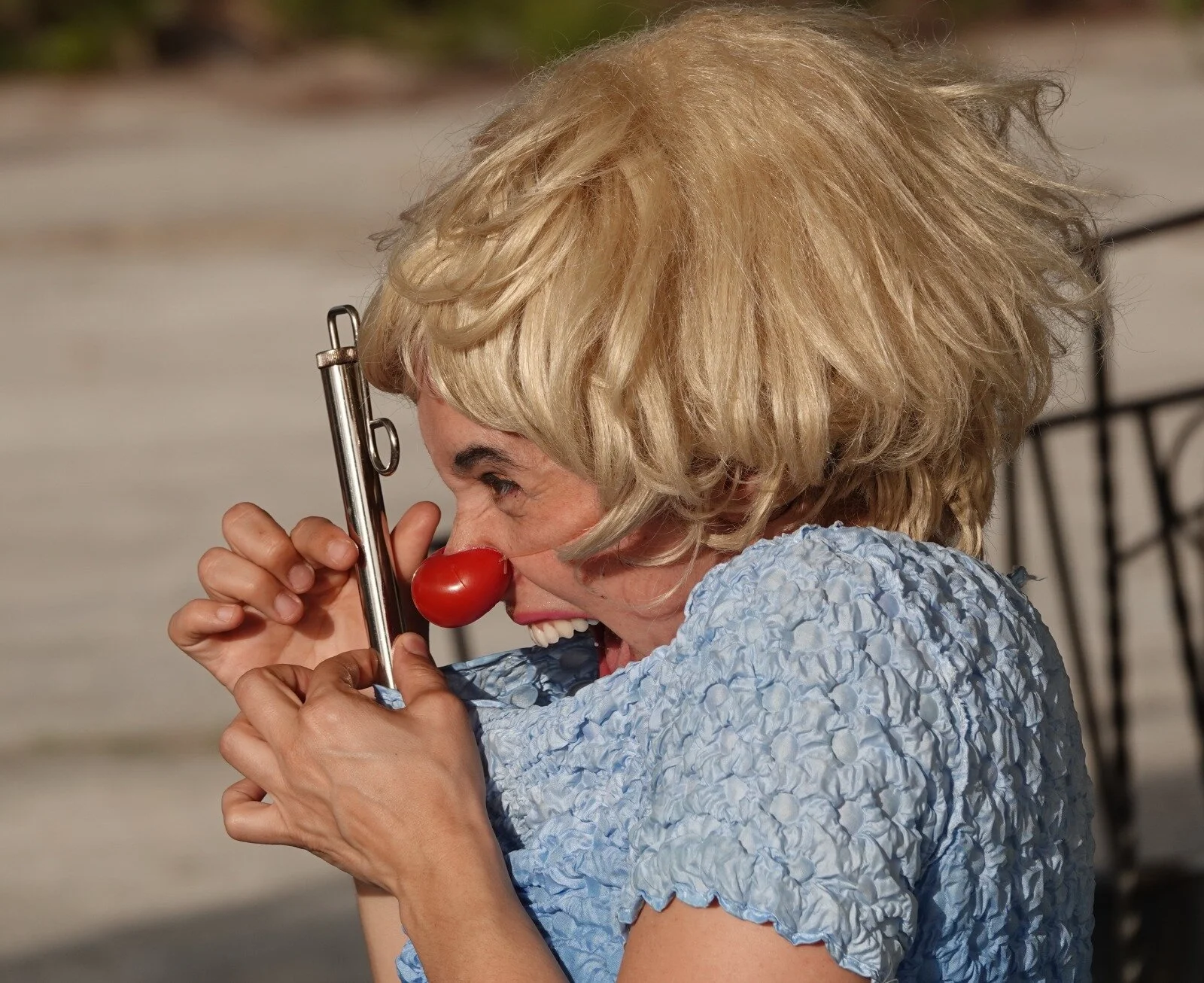 The audience arrived minutes after we got to the theater. We set up the space and did the show. We performed the show outside, in front of the theater, because the inside is flooded. The Greek masks of Tragedy and Comedy are painted on the walls of the building. The painting with the Tragedy and Comedy masks made me think of the faces of the people I’ve seen in Freeport. I’ve been fortunate to see smiles and laughter since I’ve been here. I’ve also seen the Tragedy of the storm. The evidence is in plain sight as I look around.